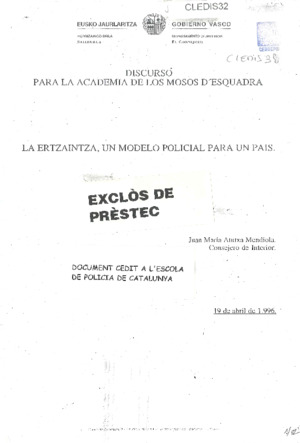 La Ertzaintza, un modelo policial para un país: discurso para la Academia de los Mossos d'Esquadra (1996)