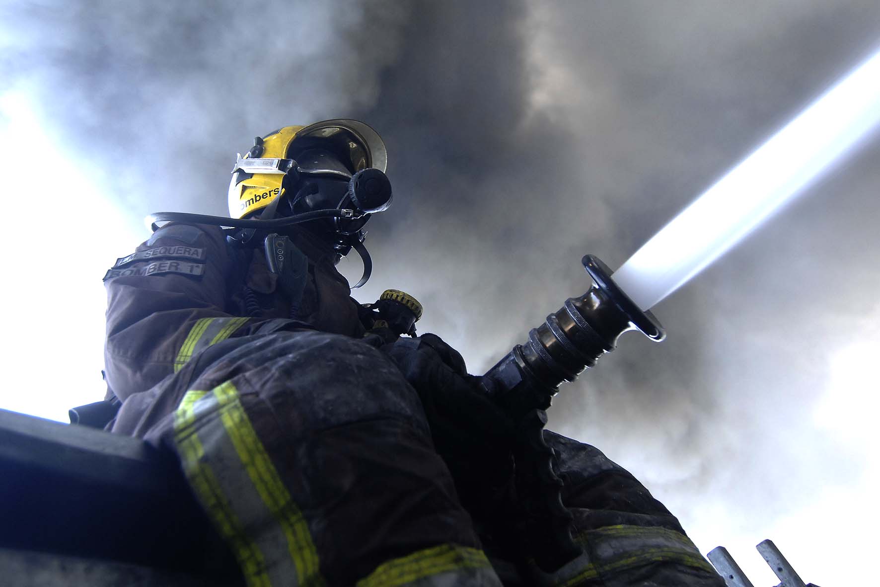 Fotografia de l'actuació d'un bomber amb mànega en un incendi d'una indústria a Ullastrell.Recommended citation