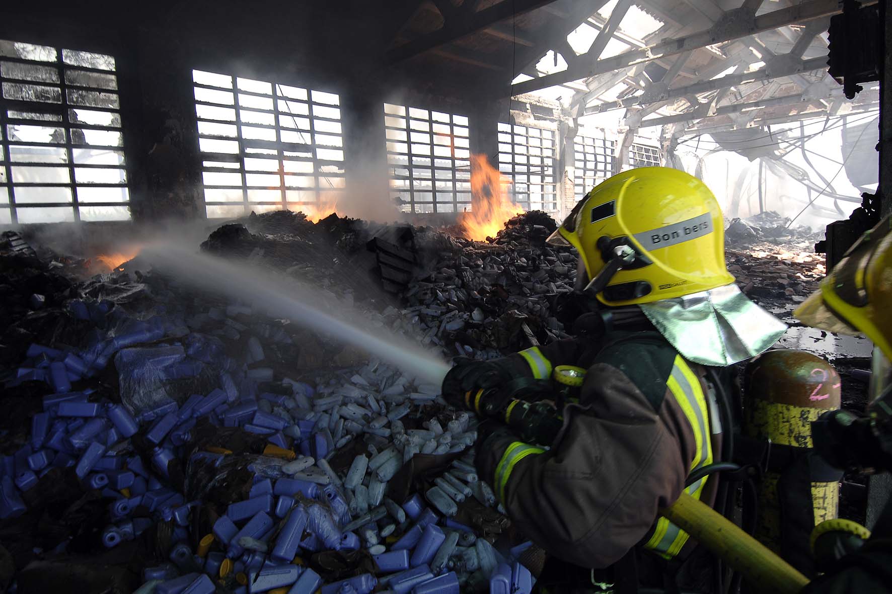 Fotografia de l'actuació d'un bomber amb mànega en un incendi d'una indústria a Ullastrell.Recommended citation