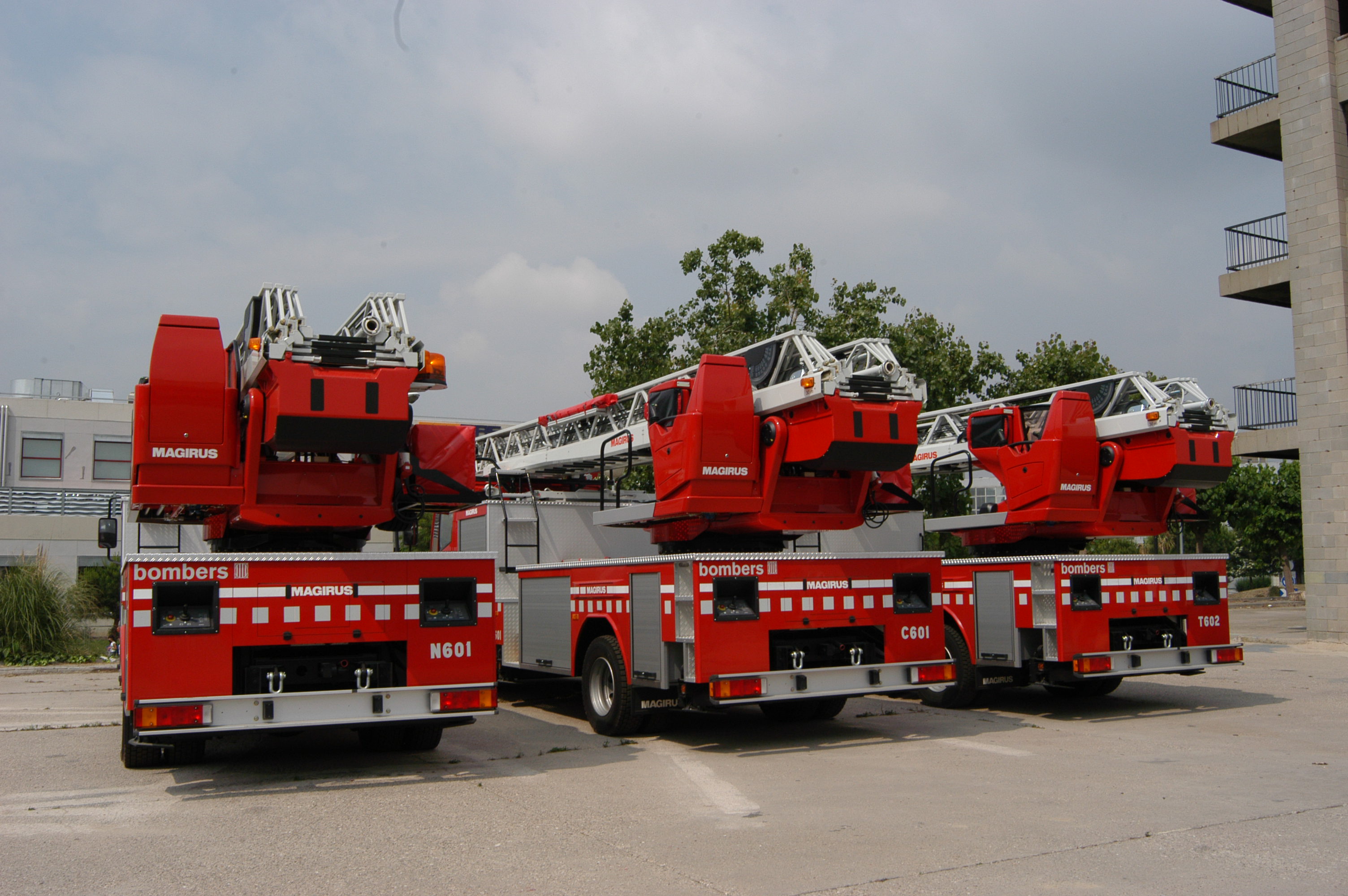 Fotografia de tres vehicles autoescales dels Bombers.Recommended citation