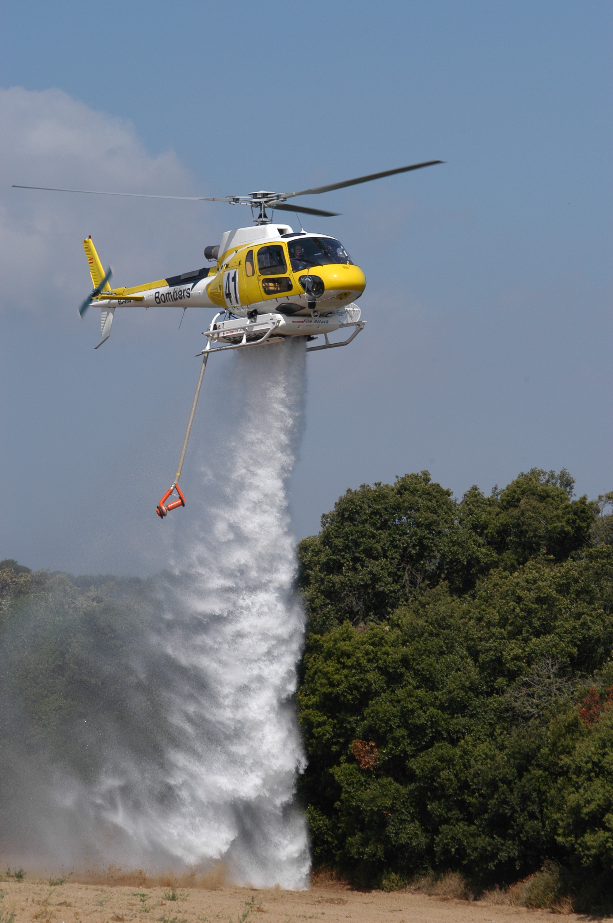 Fotografia d'un helicòpter cisterna de Bombers deixant anar aigua en un simulacre d'incendi forestal.Recommended citation