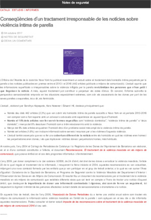 Departament d’Interior (Publicat dins el Blog Notes de seguretat https://notesdeseguretat.blog.gencat.cat/, 2017-10-04)Nota informativa sobre les conseqüències d’un tractament irresponsable de les notícies sobre violència íntima de parella.
