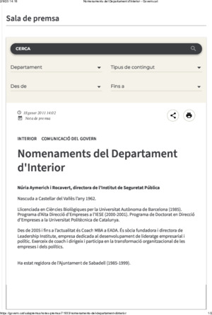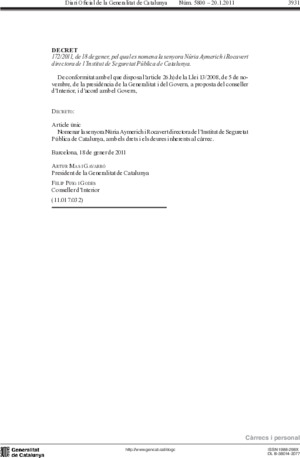 Fotografia retrat de Núria Aymerich i Rocavert, directora de l'Institut de Seguretat Pública de Catalunya. Nomenament 20 de gener de 2011 i cessament 30 de juny de 2015.Note