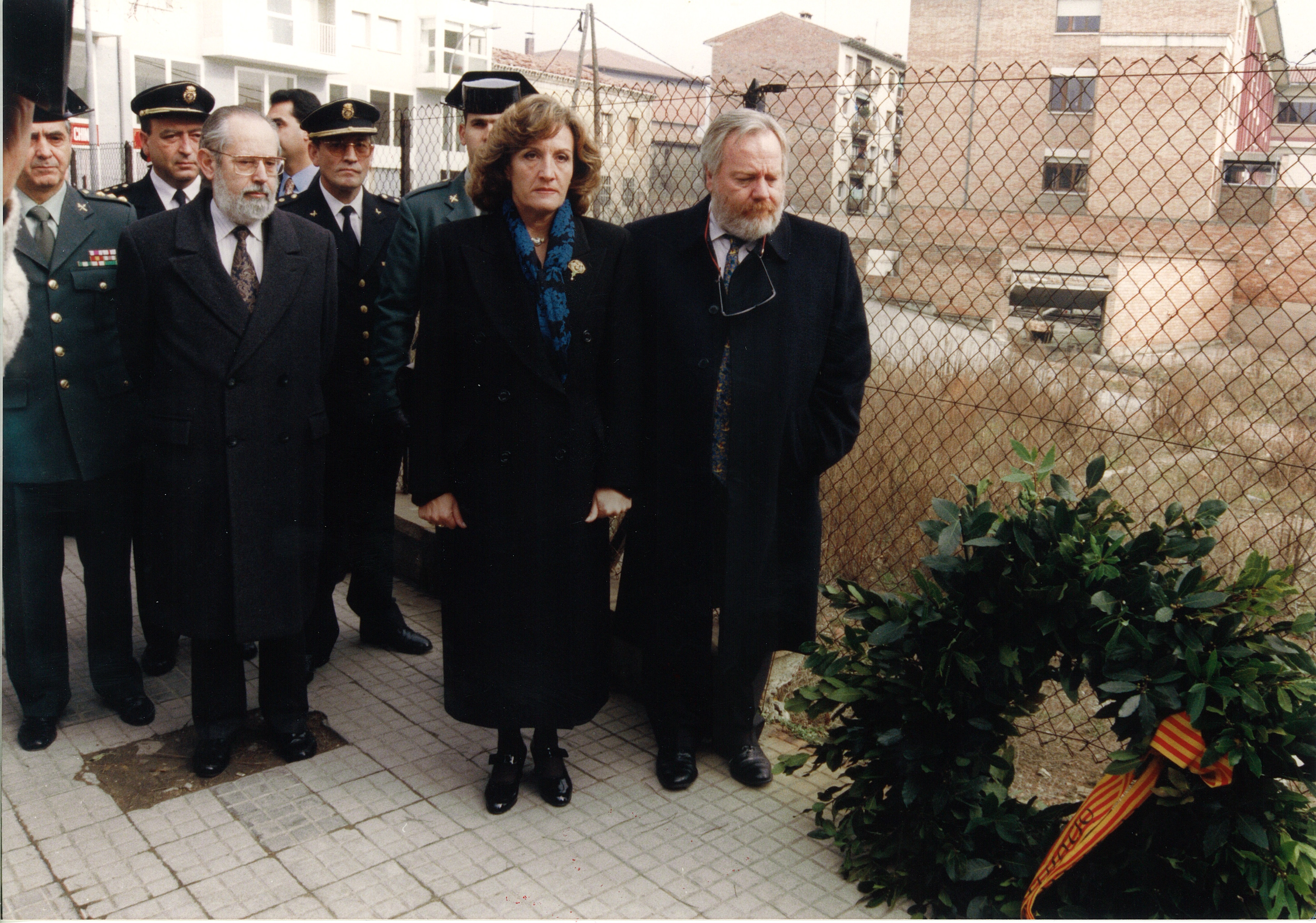 Fotografies de l'acte d'ofrena floral a les víctimes d'ETA a l'atemptat del dia 29 de maig de 1991 a Vic -un comando d'ETA va introduir un cotxe bomba a la caserna de la Guàrdia Civil de Vic, a Osona, que va explotar al pati del quarter-, amb l'assistència de la consellera de Governació Maria Eugènia Cuenca i Valero, Jaume Casanovas i Escussol i Pere Girbau, entre altres personalitats.Citación recomendada