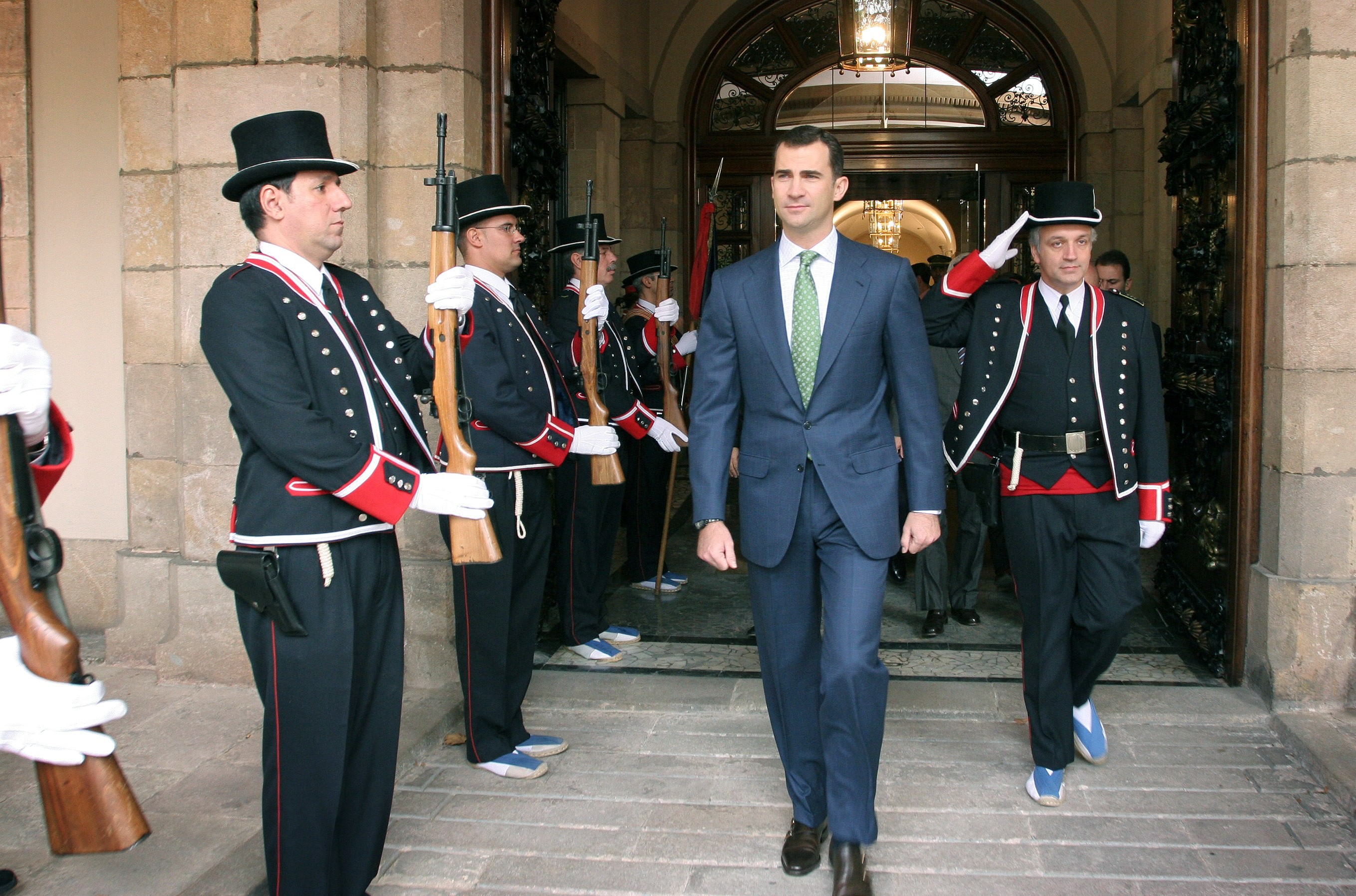 Fotografia del príncep d'Astúries Felip de Borbó sortint del Parlament de Catalunya amb la guàrdia d'honor dels Mossos d'Esquadra en la V Conferència de Presidents de Parlaments Euromediterranis.Recommended citation