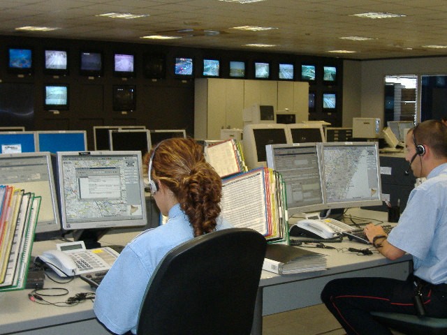 Departament d'Interior (2006-09-29)Fotografia de la sala central de l'oficina dels Mossos d'Esquadra, on apareix un Mosso d'Esquadra assegut d'esquenes davant diverses pantalles mentre parla per telèfon. -