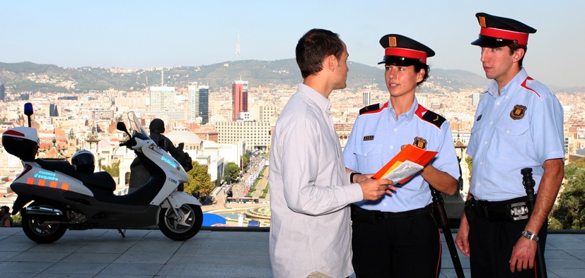Fotografia d'una parella de Mossos d'Esquadra parlant amb un vianant pel barri de Sants, darrere es veu una motocicleta policial aparcada i l'Avinguda de la Reina Maria Cristina de Barcelona.Recommended citation