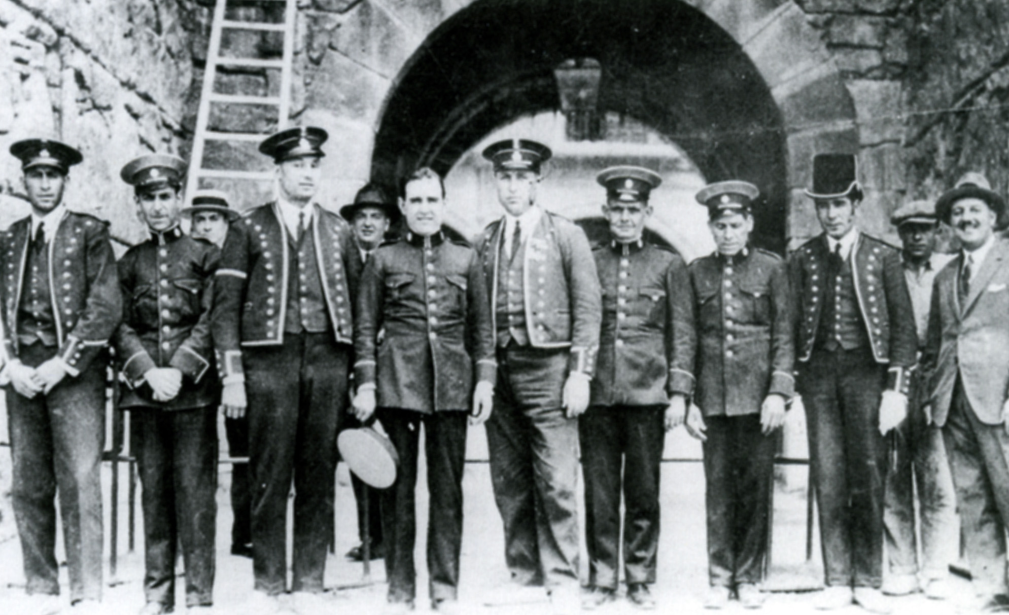 Fotografia en blanc i negre d'un grup de Mossos d'Esquadra acompanyats d'alguns homes vestits de civil posant davant la càmera.Recommended citation
