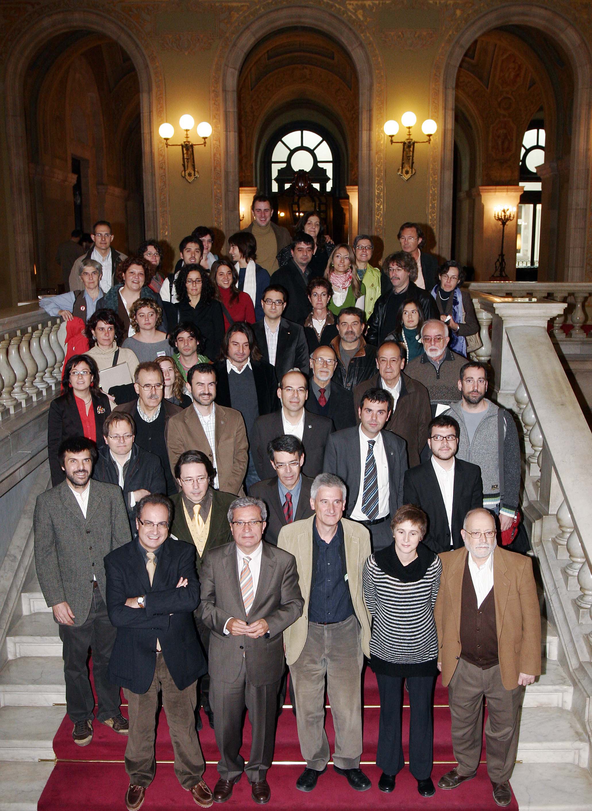 Fotografia del conseller del Departament d'Interior, Relacions Institucionals i Participació Joan Saura i Laporta, Rafael Grasa i Hernández i Xavier Badia Cardús, entre altres personalitats, a les escales del Parlament de Catalunya després de l'aprovació de la Llei de l'Institut Català Internacional per la Pau (ICIP), que preveu la creació d'un organisme independent dedicat a la promoció de la cultura de la pau, la mediació en conflictes, la recerca i la formació.Recommended citation