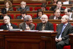 Guillamet, Eva (2007-11-25)Fotografia del president de la Generalitat de Catalunya José Montilla, el conseller del Departament d'Interior, Relacions Institucionals i Participació Joan Saura i Laporta, Antoni Castells i Oliveres ... -