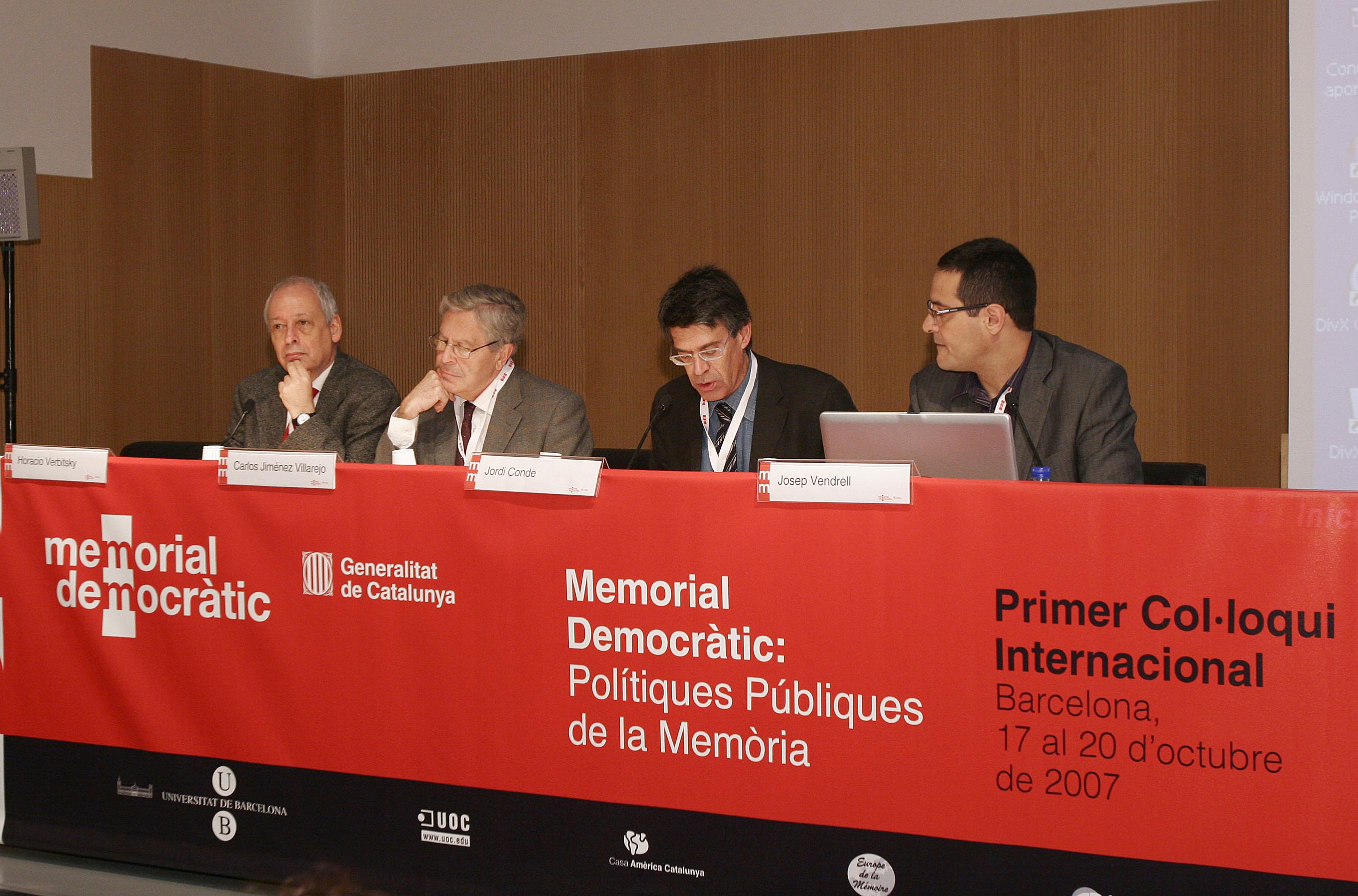 Fotografia de la taula presidencial de la celebració del Primer Col·loqui Internacional Memorial Democràtic, amb Horacio Verbitsky, Carlos Jiménez Villarejo, Jordi Conde i Josep Vendrell Gardeñes.Recommended citation