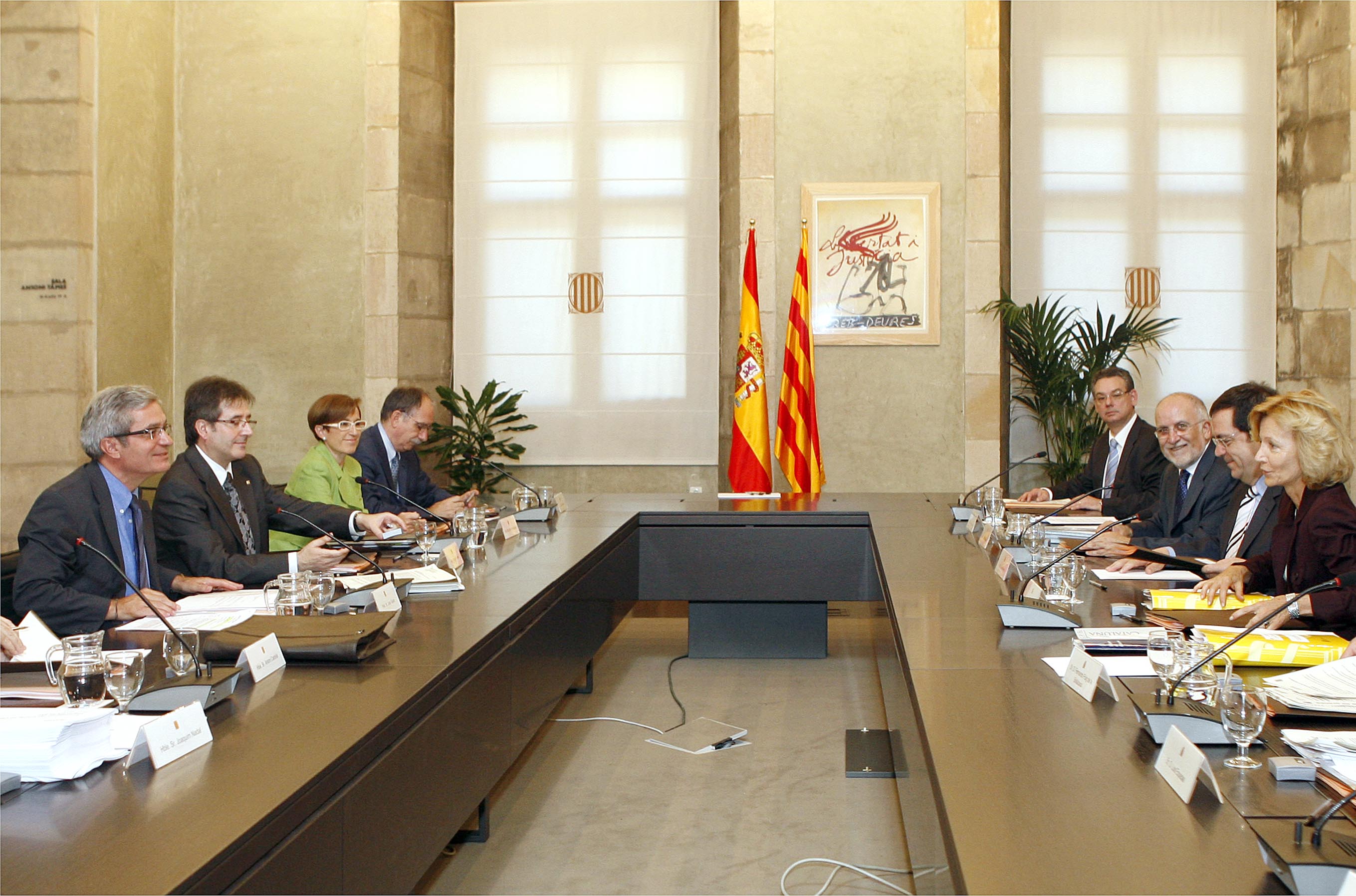Fotografies de la cinquena reunió de la Comissió Bilateral Generalitat – Estat, amb l'assistència del conseller del Departament d'Interior, Relacions Institucionals i Participació Joan Saura i Laporta, la ministra d'Administracions Públiques Elena Salgado, la consellera de Treball Mar Serna i el delegat del Govern espanyol a Catalunya Joan Rangel, entre altres representants polítics.Recommended citation
