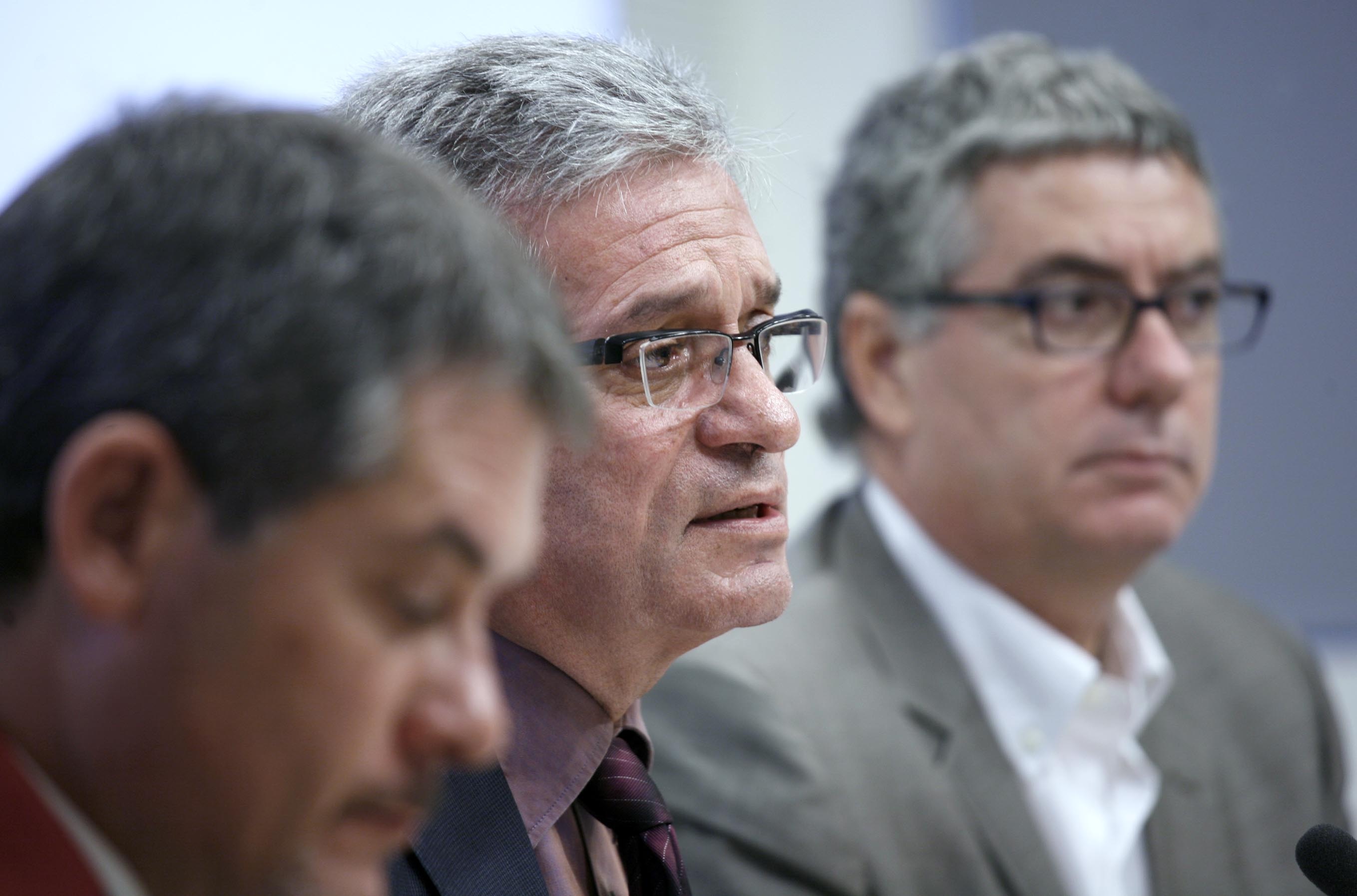 Guillamet, Eva (2008-01-02)Fotografia del conseller del Departament d'Interior, Relacions Institucionals i Participació Joan Saura, Sergi Pla i Simón i Josep Pérez i Moya en la presentació del balanç de la sinistralitat viària ... -