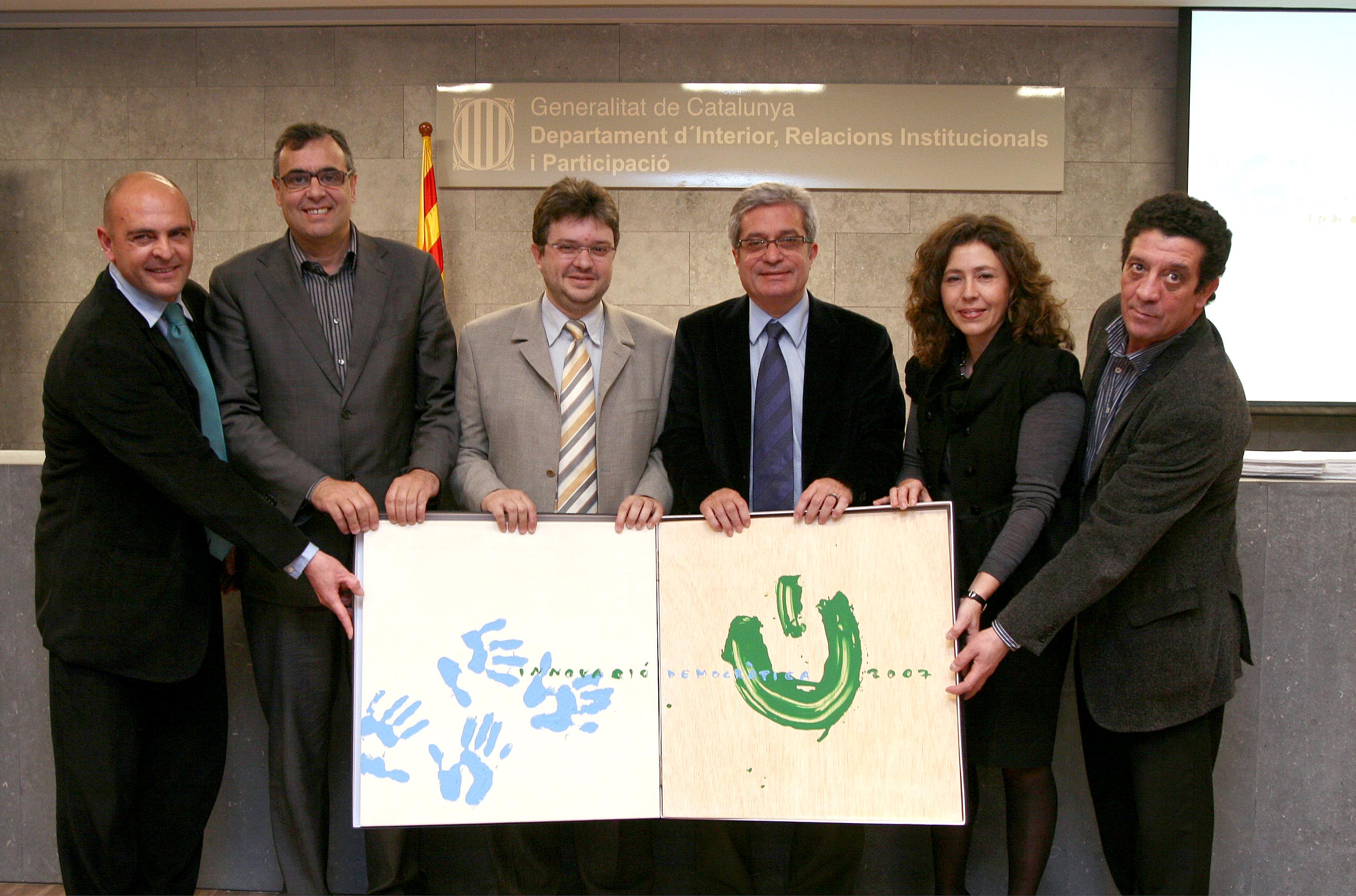 Fotografia del conseller del Departament d'Interior, Relacions Institucionals i Participació Joan Saura i Laporta, Joaquim Brugué, Jordi Baiget, Marcel Esteve Robert, Cristina Alsina i Ricard Herrero Suñer en l’entrega de guardons dels premis d'Innovació Democràtica als ajuntaments de Girona, Sitges, Vilafranca del Penedès i Santa Cristina d'Aro.Recommended citation