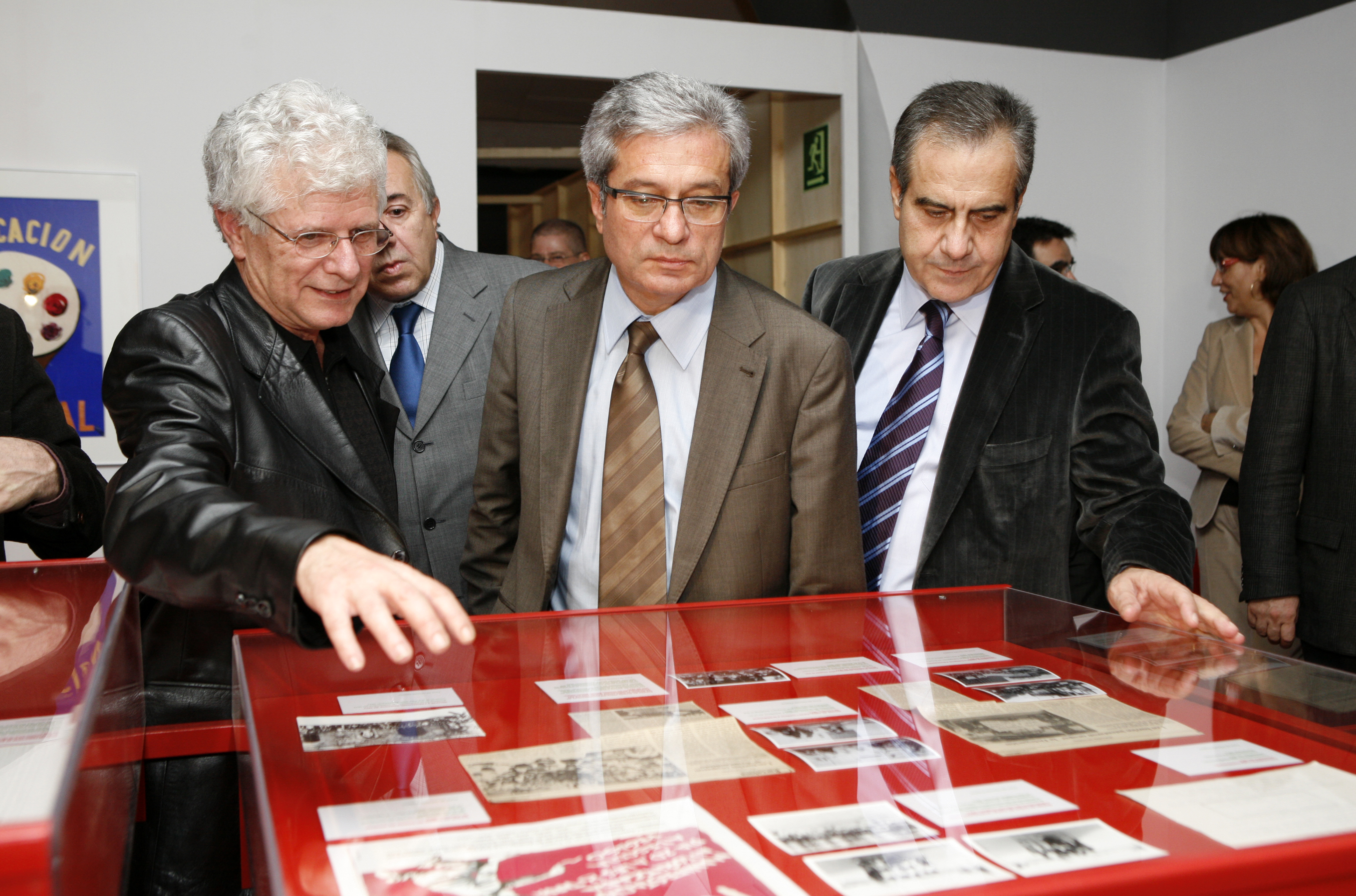 Fotografia del conseller del Departament d'Interior, Relacions Institucionals i Participació Joan Saura i Laporta, Ricard Vinyes i Ribas i Celestino Corbacho en la inauguració al CCCB de l'exposició 'En transició'.Recommended citation