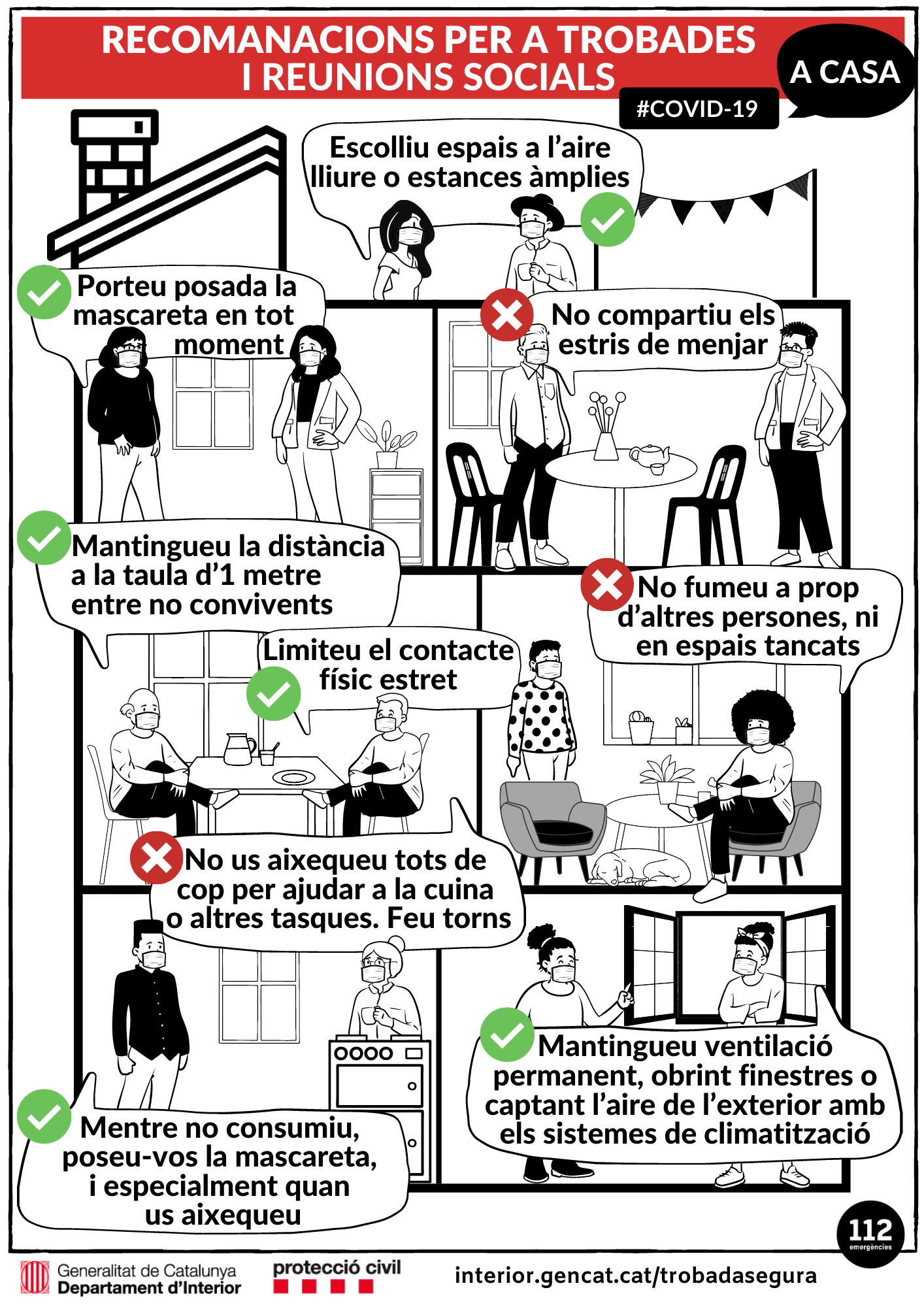 Infografies realitzades per Protecció Civil amb la voluntat de sensibilitzar a la ciutadania sobre la pandèmia. Inclou mesures de seguretat en restauració, en trobades i reunions socials i a la llar.Recommended citation