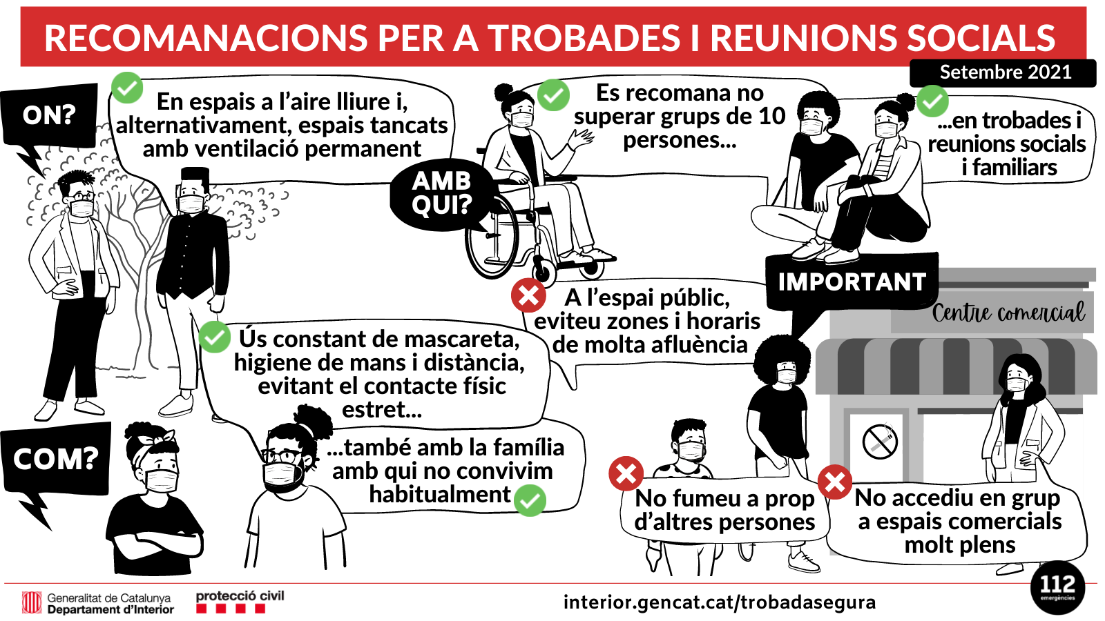 Protecció Civil. Recomanacions i mesures de seguretat en el marc de la pandèmia de Covid-19. Barcelona: Departament d'Interior, 2021. 6 infografies.