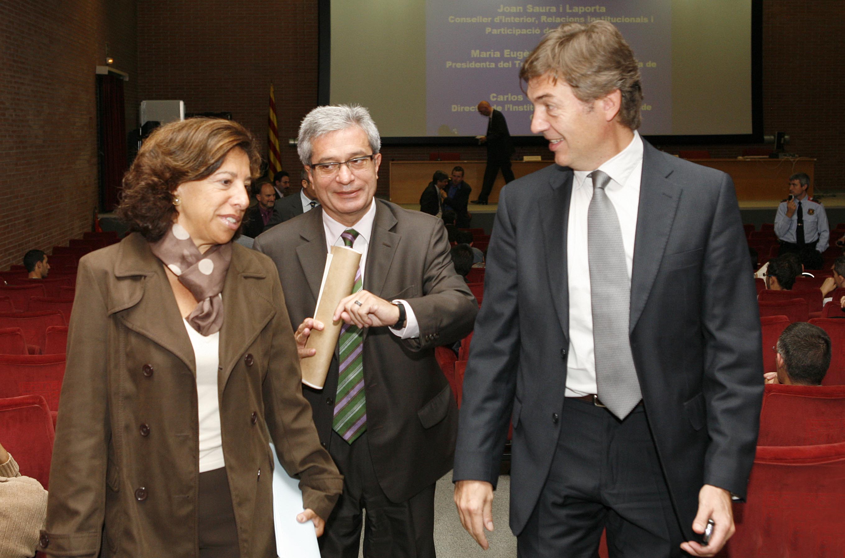 Fotografia del conseller del Departament d'Interior, Relacions Institucionals i Participació Joan Saura i Laporta, Maria Eugènia Alegret i Burgués i Olga Lanau i Rami en la inauguració de les Jornades sobre videovigilància a l'Institut de Seguretat Pública de Catalunya (ISPC).Recommended citation