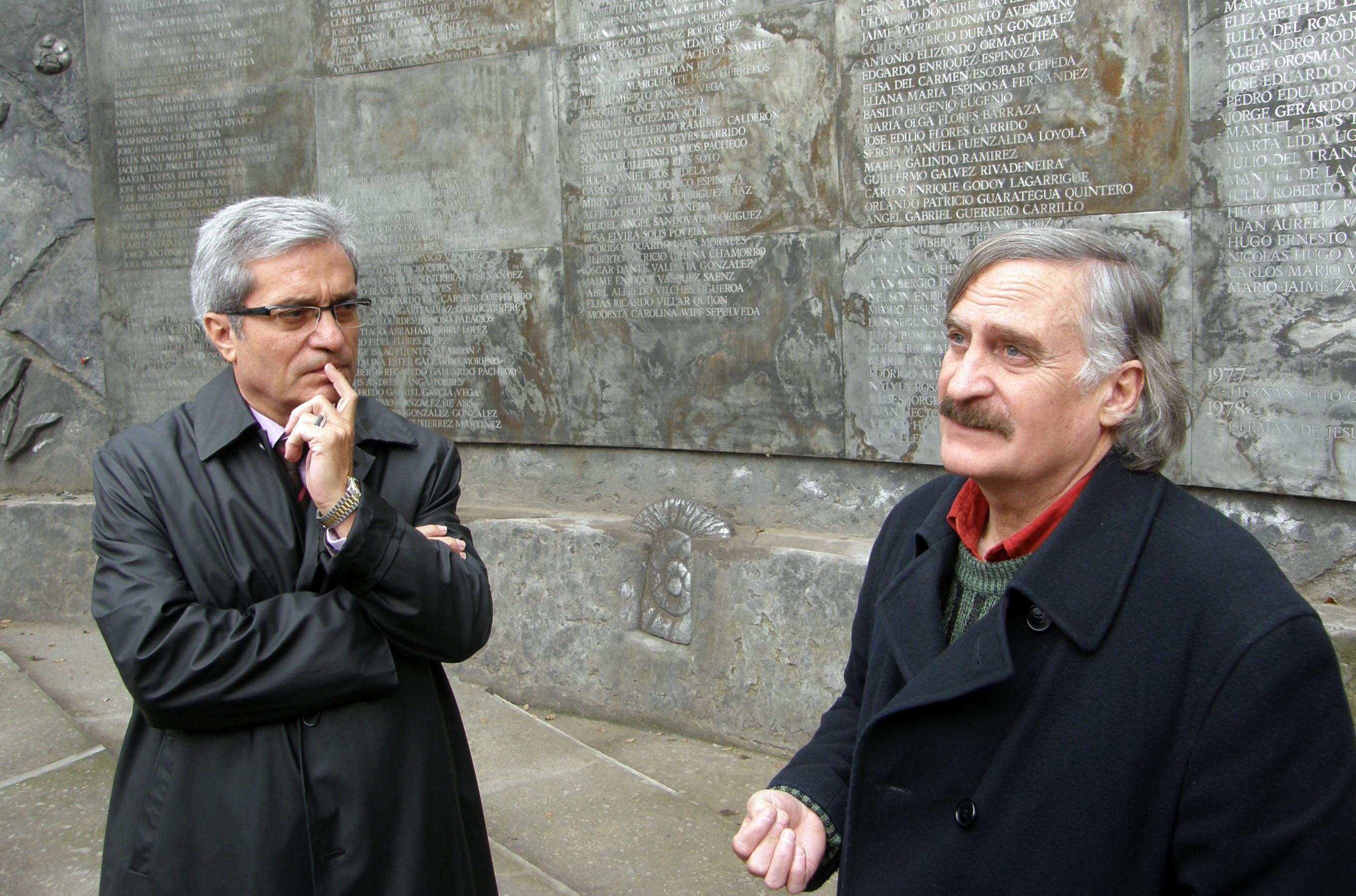 Fotografia del conseller del Departament d'Interior, Relacions Institucionals i Participació Joan Saura amb Rodrigo del Villar davant el Mur de Villa Grimaldi, a Santiago de Xile, on apareixen els noms de molts dels desapareguts en aquest antic centre de detenció i tortura.Recommended citation