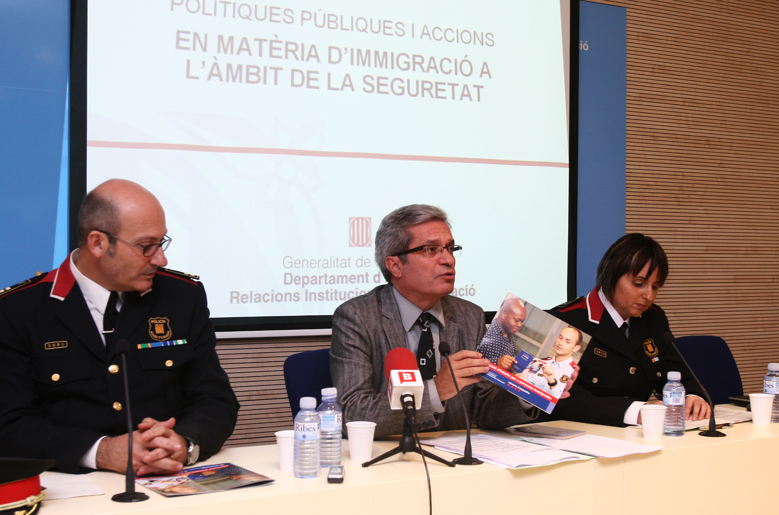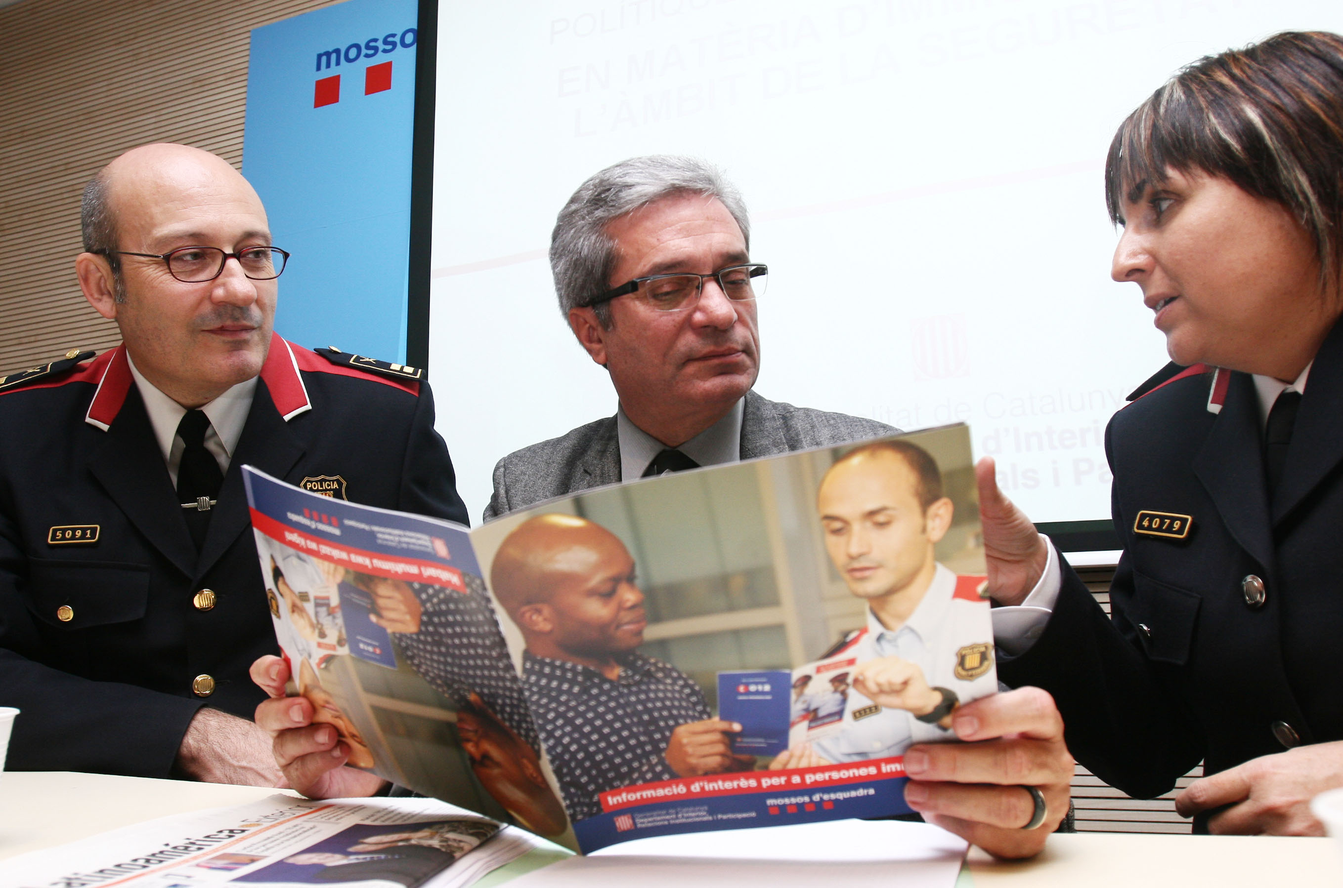 Fotografies de l'acte de presentació de les accions que duen a terme els Mossos d'Esquadra per incorporar la perspectiva de la immigració a les polítiques públiques de seguretat, amb l'assistència del conseller del Departament d'Interior, Relacions Institucionals i Participació Joan Saura, Josep Milán i Rosa Negre.Recommended citation