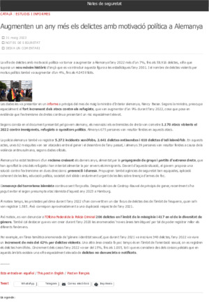 Departament d'Interior (Publicat dins el Blog Notes de seguretat https://notesdeseguretat.blog.gencat.cat/, 2023-05-31)Nota informativa sobre com la xifra de delictes amb motivació política va tornar a augmentar a Alemanya l’any 2022 més d’un 7%, fins als 58.916 delictes, xifra que suposa un nou màxim històric d’ençà ...