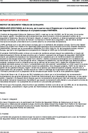 El projecte de recerca PANTHEON, s'ha finançat amb fons de la Unió Europea. L'Institut de Seguretat Pública de Catalunya és un dels 17 socis participants de 9 països europeus diferents: Grècia, França, Bèlgica, Romania, Eslovàquia, Armènia, Àustria, Malta i Espanya. El projecte PANTHEON pretén millorar els models de resiliència actuals davant les catàstrofes, a través del desenvolupament d'eines de base empírica per a l'anàlisi i avaluació de polítiques de seguretat.Recommended citation