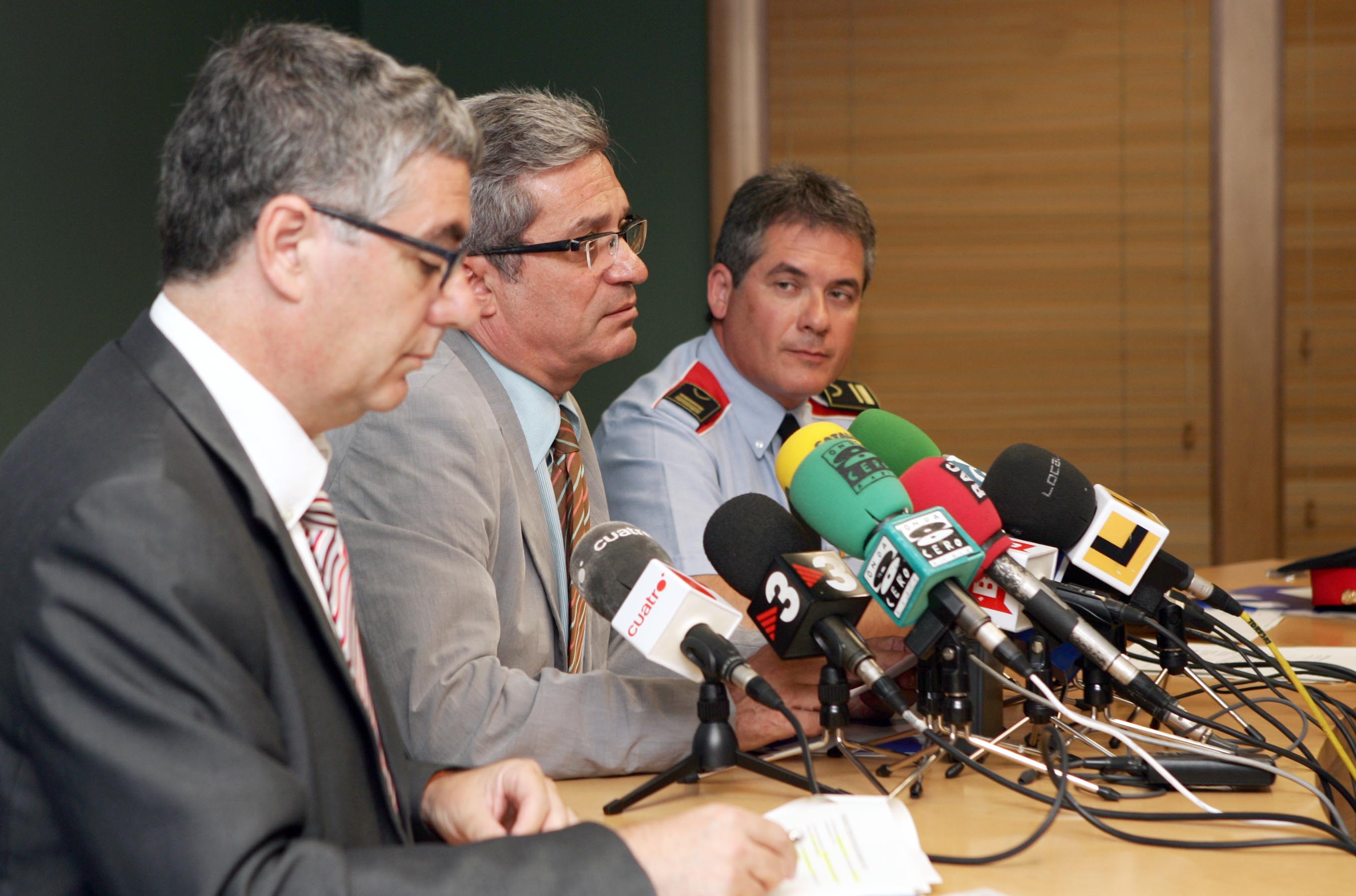 Fotografia del conseller del Departament d'Interior, Relacions Institucionals i Participació Joan Saura, Josep Pérez i Moya i Sergi Pla i Simón en la roda de premsa de la presentació de dades del permís per punts al Servei Català de Trànsit.Citación recomendada