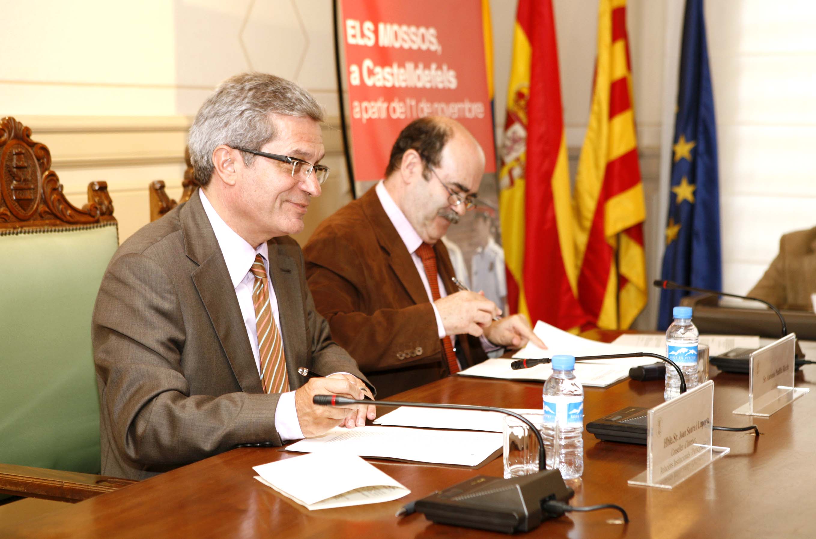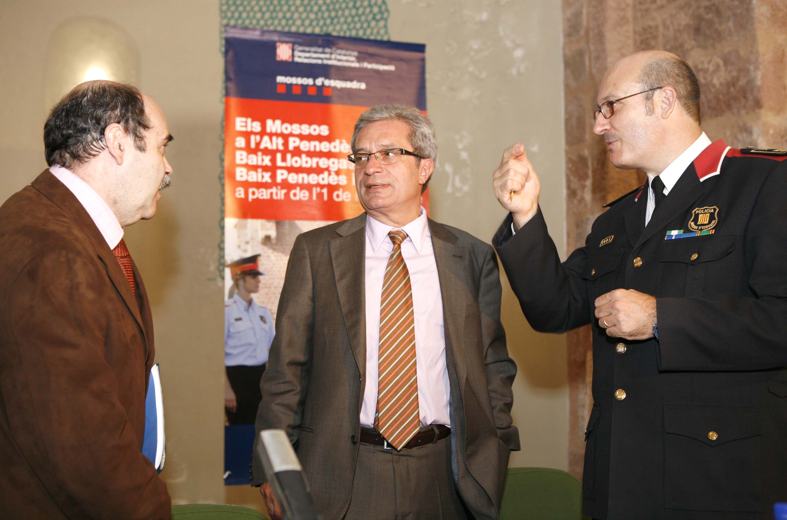 Guillamet, Eva (2007-10-31)Fotografia del conseller del Departament d'Interior, Relacions Institucionals i Participació Joan Saura amb l'alcalde de Sant Feliu de Llobregat, Juan Antonio Vázquez, durant el desplegament dels Mossos ... -