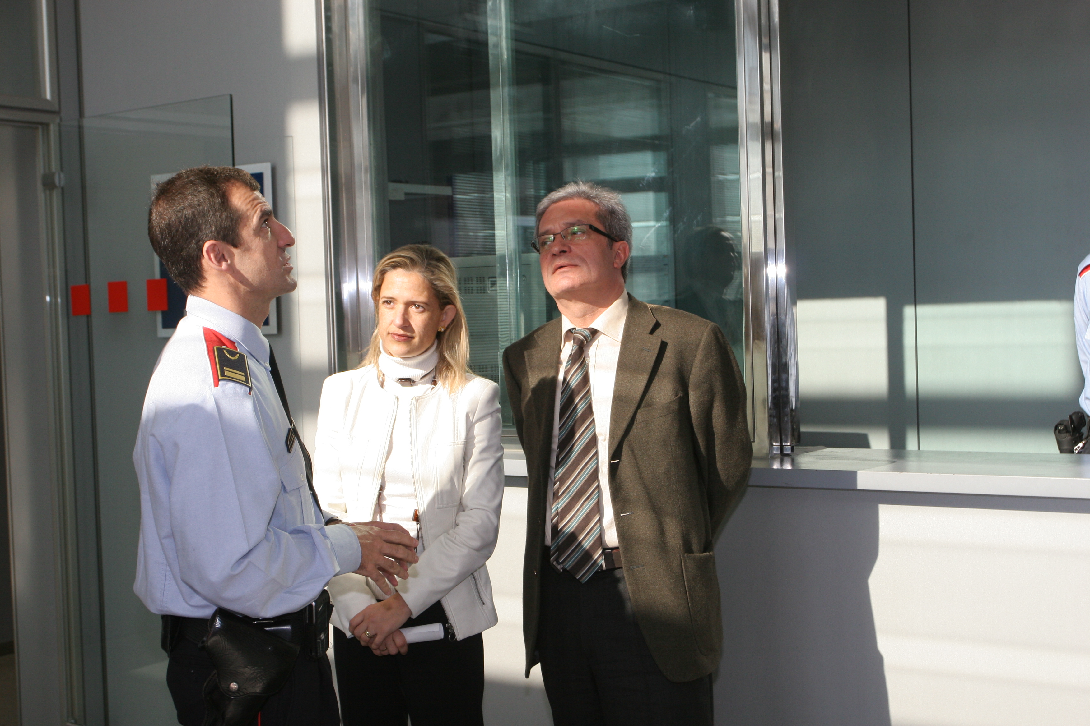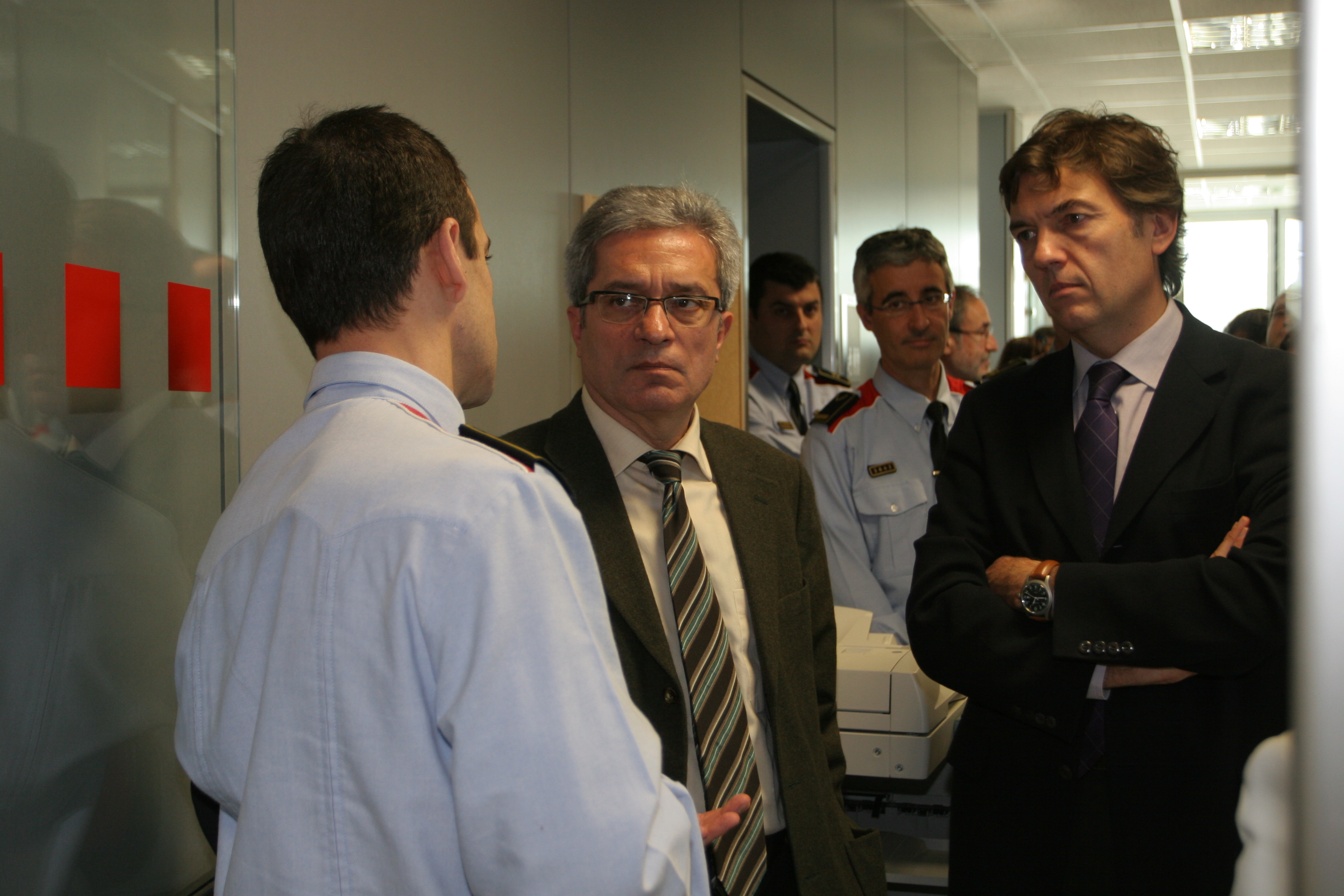 Fotografies de la visita del conseller del Departament d'Interior, Relacions Institucionals i Participació Joan Saura i Laporta a l'Àrea Bàsica Policial (ABP) d'Esplugues de Llobregat, acompanyat per Joan Delort i Menal i Pilar Díaz, entre altres personalitats.Citación recomendada