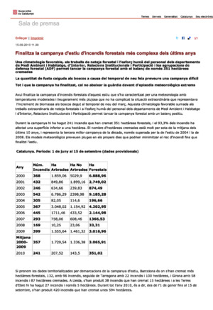 Departament d'Interior, Relacions Institucionals i Participació; Departament de Medi Ambient i Habitatge. Campanya forestal 2010: Presentació i Balanç. Barcelona: Generalitat de Catalunya, 2010. 2 notes de premsa