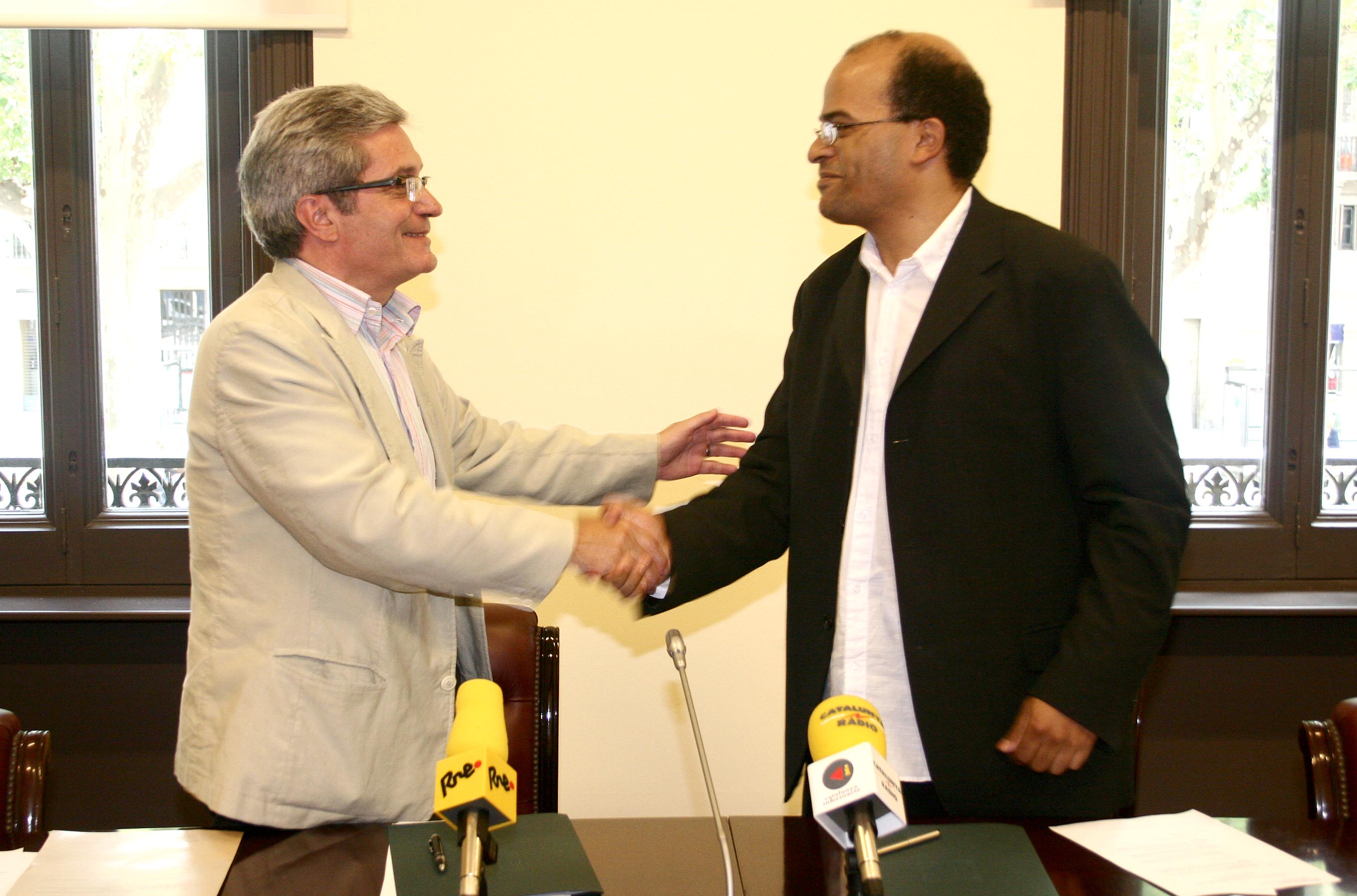 Signatura de conveni de col·laboració per treballar conjuntament en la gestió de la diversitat i la promoció dels drets humans en l'àmbit policial (2008) [Fotografia]