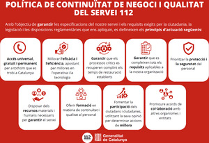 (2024)Infografia institucional que resumeix els principis d’actuació del servei d’emergències 112 de Catalunya en matèria de continuïtat de negoci i qualitat del servei. Es recullen compromisos com l’accessibilitat ... -