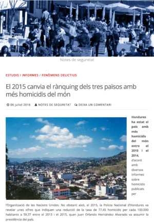Departament d'Interior (Publicat dins el Blog Notes de seguretat https://notesdeseguretat.blog.gencat.cat/, 2016-07-06)Nota informativa sobre el canvi del rànquing dels tres països amb més homicidis del món el 2015.